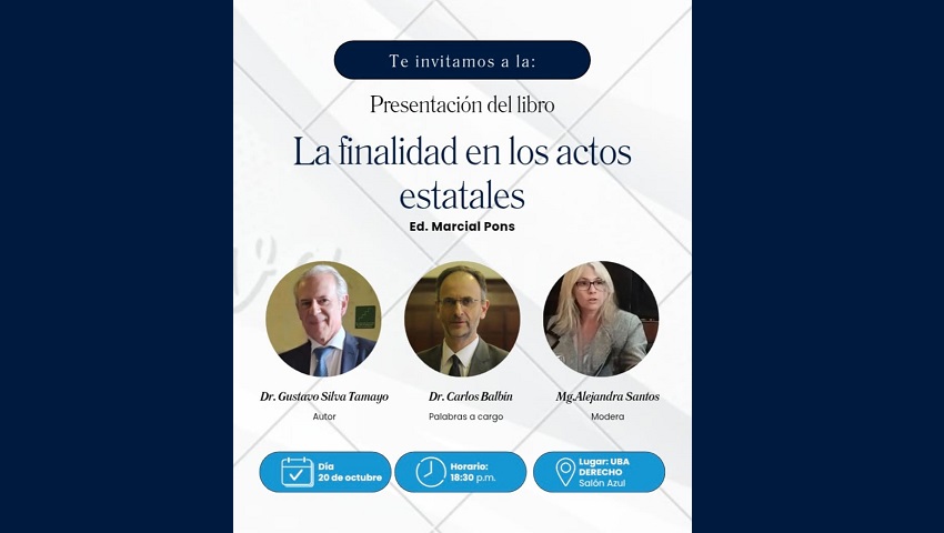 El próximo 20 de octubre a las 18:30 h, en el Salón Azul de la Facultad de Derecho de la Universidad de Buenos Aires, se llevará a cabo la presentación del libro “La finalidad en los actos estatales”, publicado por Editorial Marcial Pons.