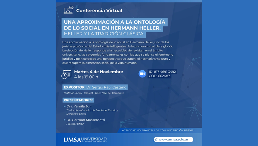 La Universidad del Museo Social Argentino (UMSA) invita a participar de la conferencia virtual titulada “Una aproximación a la ontología de lo social en Hermann Heller. Heller y la tradición clásica”, que se realizará el martes 4 de noviembre a las 19:00 h.